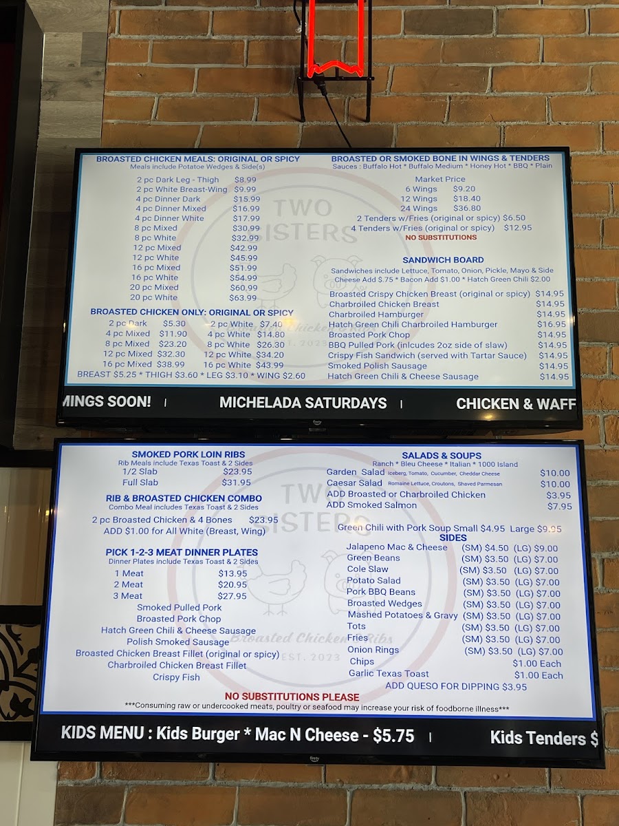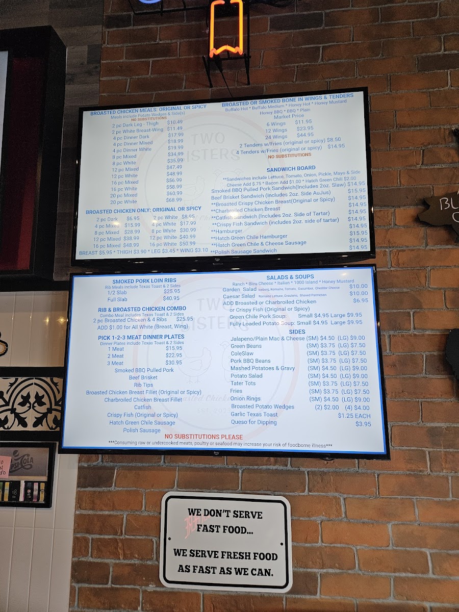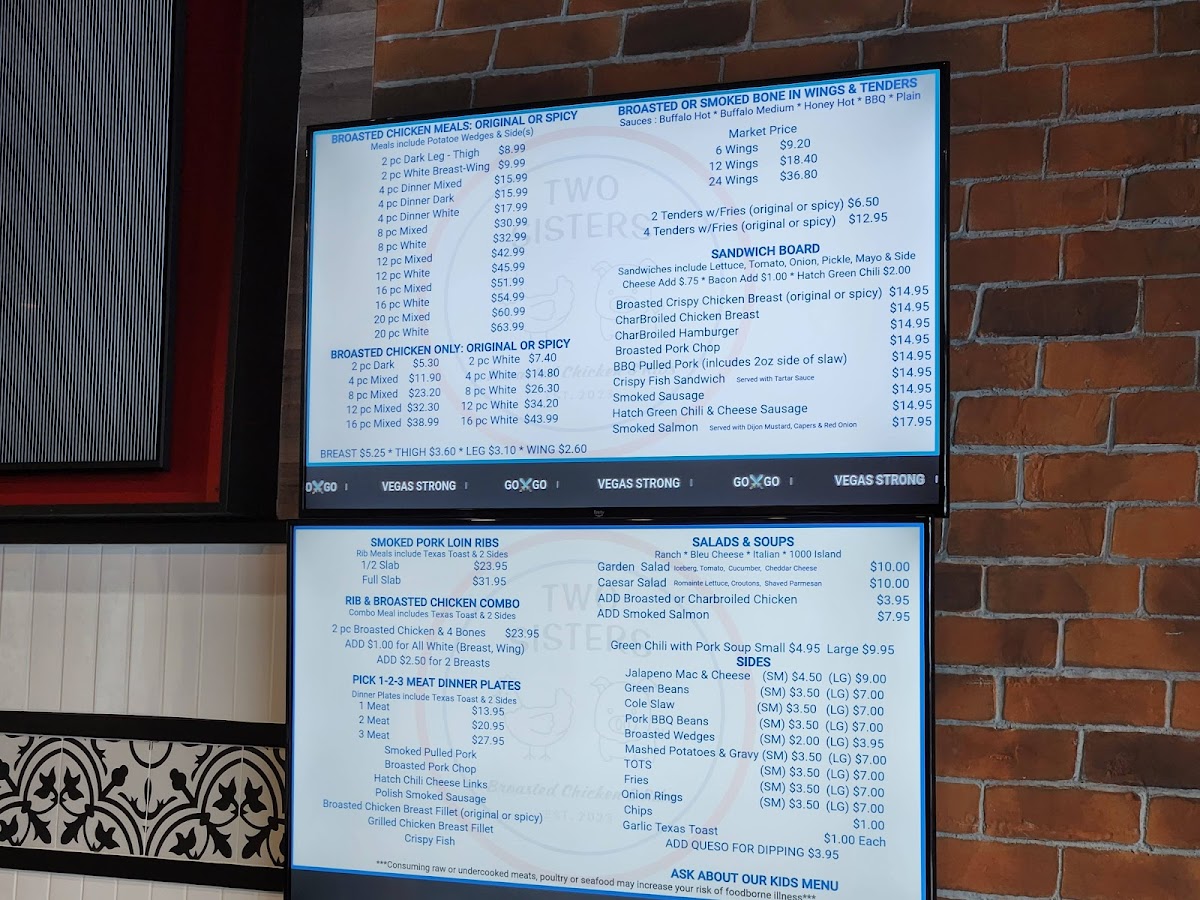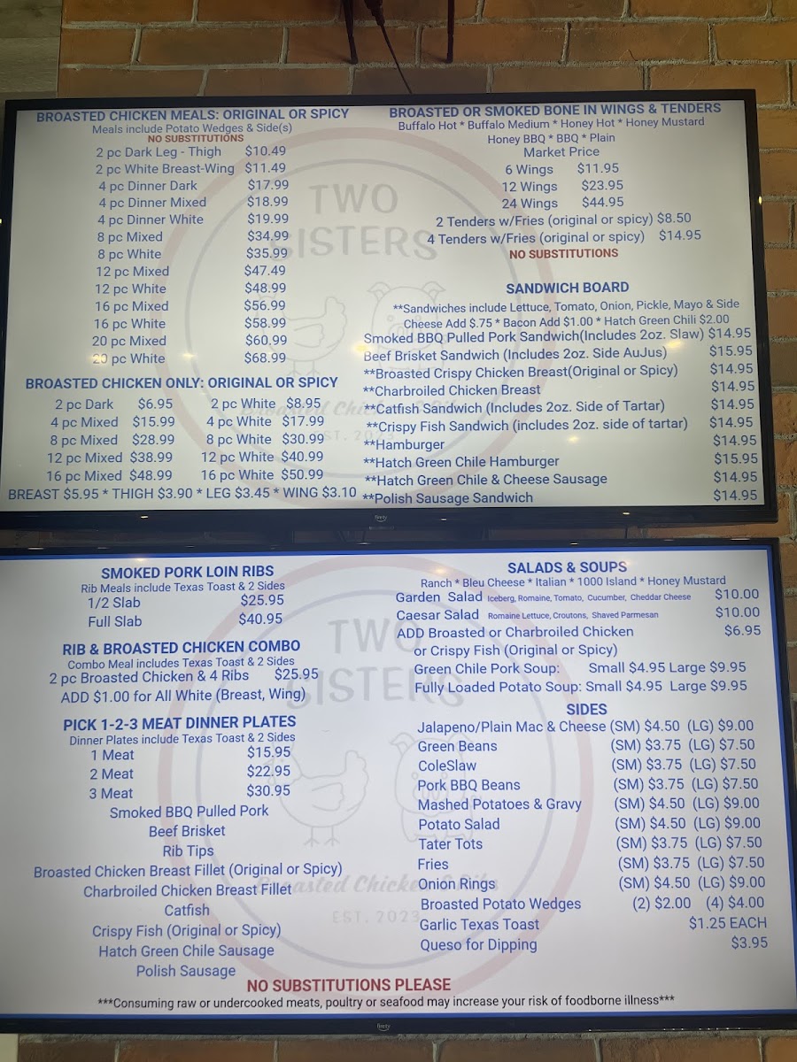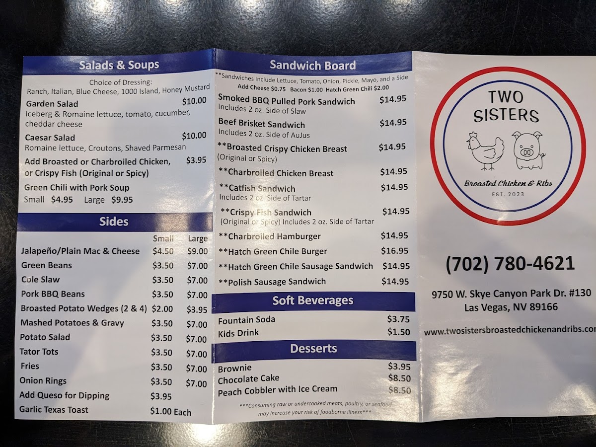 Two Sisters Broasted Chicken and Ribs in Las Vegas offers a diverse and flavorful menu, perfect for meat lovers. Their Meat Dinner Plates include options like the 1 Meat, 2 Meat, and 3 Meat plates, giving diners the flexibility to enjoy a variety of proteins. The restaurant’s Bone-In Wings and Chicken Tenders are a popular choice for those seeking comfort food. For those craving the signature flavor of broasted chicken, the Broasted Chicken Only section features options like Thigh, Mixed (Dark & White Meat), and WingLeg with choices such as 2 Pieces or larger portions. The Ribs & Broasted Chicken Combo offers the best of both worlds. For those with a sweet tooth, desserts like Chocolate Cake, Peach Cobbler With Ice Cream, and a Brownie offer a perfect ending to the meal. Beverage options include the usual Fountain Soda and Kids Drink for the little ones. The Kids Menu includes dishes like Kids Mac & Cheese, Kids Tenders, and Kids Wings (4 pieces). Sandwich lovers can enjoy the Hatch Green Chili Charbroiled Hamburger, BBQ Pulled Pork Sandwich, and Crispy Fish Sandwich, among others. On the side, guests can choose from favorites like Pork BBQ Beans, Onion Rings, Green Beans, Tots, and Mashed Potatoes & Gravy. The Smoked Pork Loin Spare Ribs is another excellent choice for those craving tender, smoky flavors. The menu also features fresh options like Caesar Salad, Garden Salad, and the flavorful Green Chili With Pork Soup. Whether you’re in the mood for comfort food or a hearty meal, Two Sisters offers something to satisfy every craving.